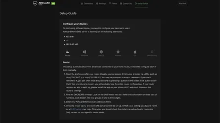 你可以在 AdGuard Home 仪表盘顶部导航菜单的 Setup Guide 选项中找到大多数设备类型的配置设置。