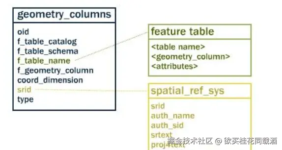 4. 创建的带空间信息的表(feature_table)、geometry_colums表、sptatial_ref_sys表三者之间相互关联才能支持完整的地理空间信息表达