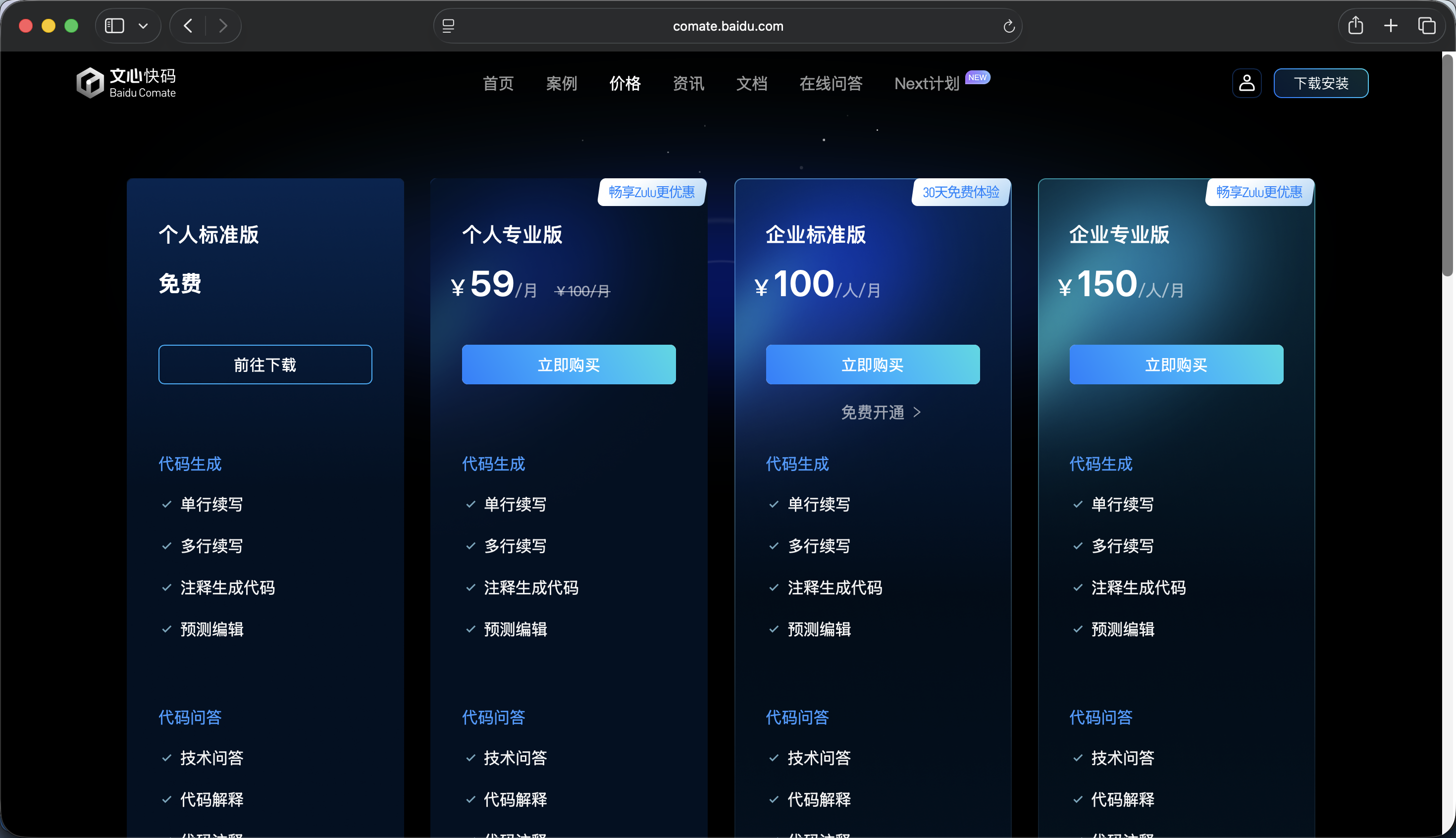 **官网订阅类型:**https://comate.baidu.com/zh/pricing