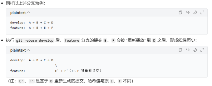 rebase:将当前分支的所有提交 "移植" 到 develop 分支的最新提交之上,使当前分支的提交历史呈现为一条直线,消除合并提交