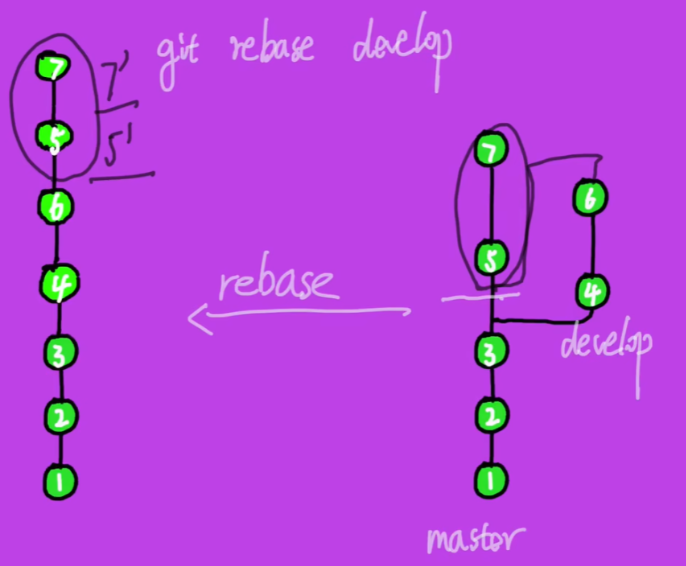 git rebase develop # 将master和develop的公共祖先3,将master的3号节点后面的所有提交记录截取下来,嫁接到develop的分支线的后面。