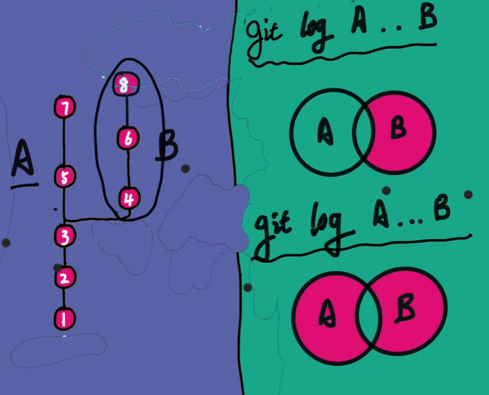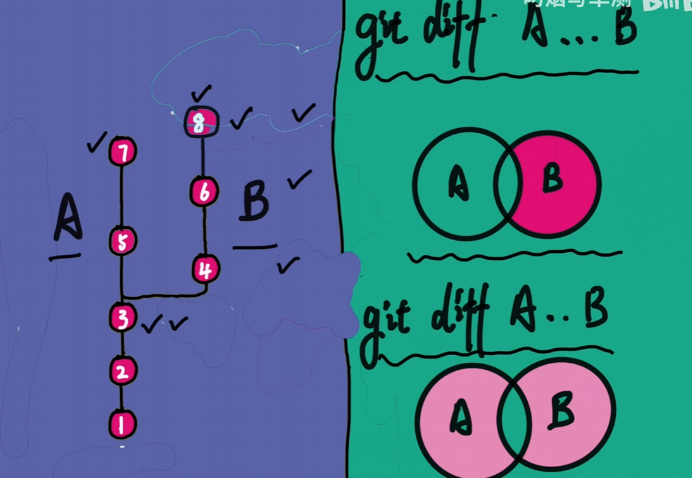 git diff A...B # B相对AB祖先的区别 4 6 8相对3的区别