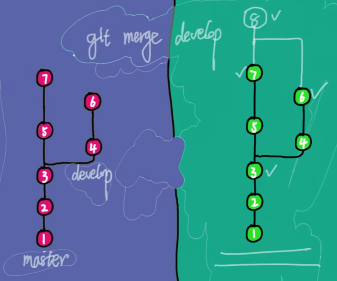 git merge develop # 将develop合并到master 就会将3、6、7合形成8