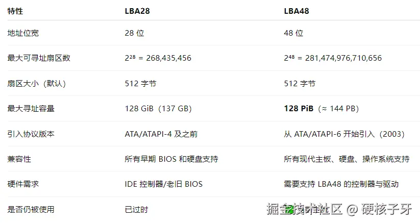 再来说说LBA是什么?它其实是一种磁盘坐标,32位时代用的是LBA28,64位时代用的是LBA48