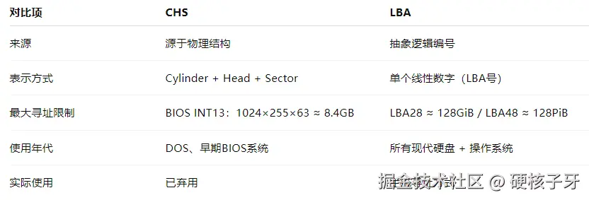 与LBA相对的是CHS,就是大家听过的柱面、磁头、扇区。以前定位一个扇区,要通过这三个坐标。机械盘淘汰后,加上CHS能表达的磁盘空间有限,就改用了LBA。比如0柱面0磁头1扇区,对应的就是LBA=1