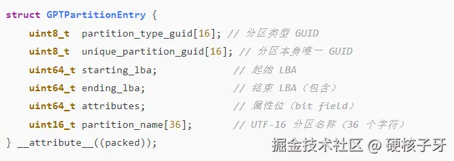 三、GPT支持最多128个分区,每个分区信息占128B,128*128B=16K=32个扇区。所以存放GPT分区信息是2-33,还有备份的是LBA-33至LBA-2。GPT分区信息长这样