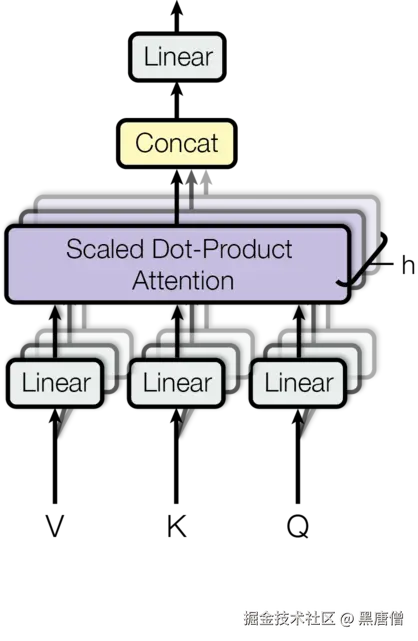 其中每个头计算为: <math xmlns="http://www.w3.org/1998/Math/MathML"> head i = Attention ( Q W i Q , K W i K , V W i V ) \text{head}_i = \text{Attention}(QW_i^Q, KW_i^K, VW_i^V) </math>headi=Attention(QWiQ,KWiK,VWiV)