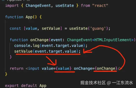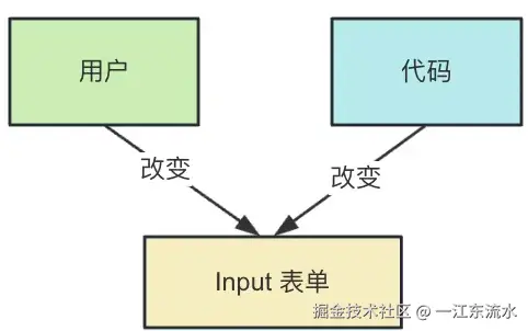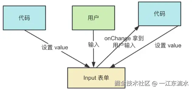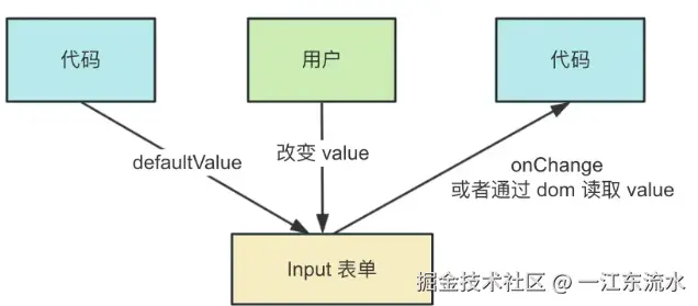代码设置表单的初始 value,但是能改变 value 的只有用户,代码通过监听 onChange 来拿到最新的值,或者通过 ref 拿到 dom 之后读取 value。