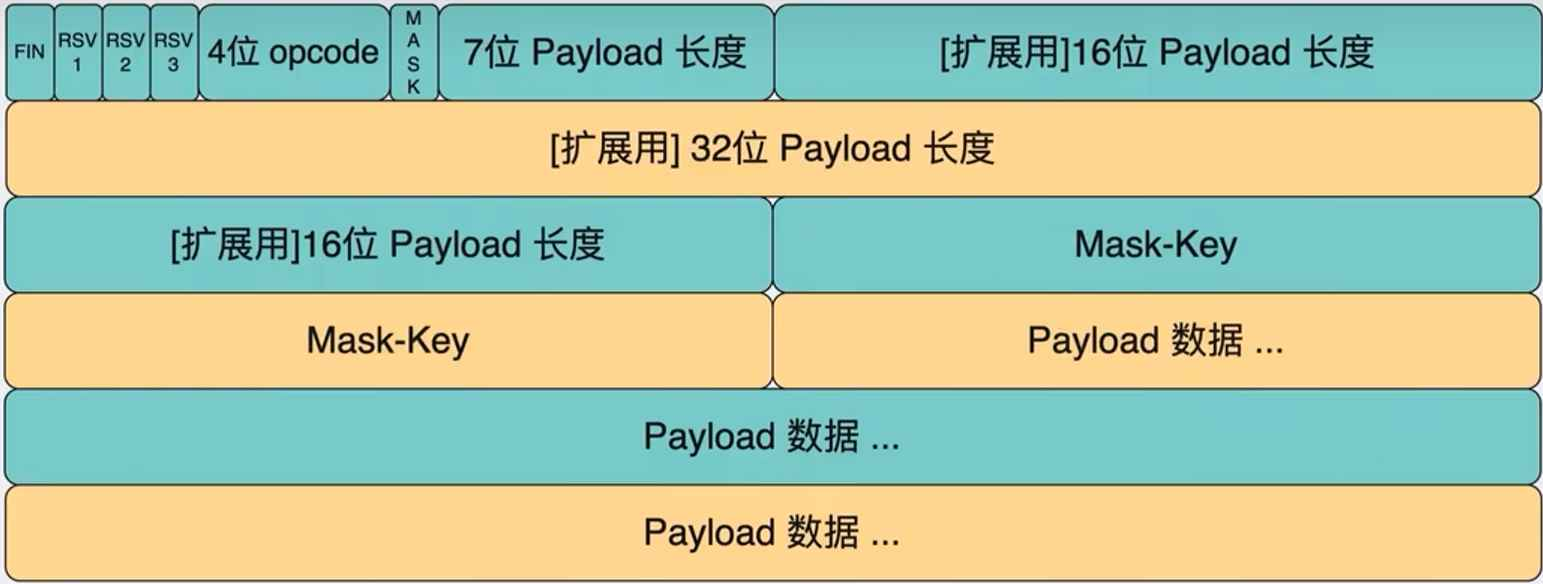 - FIN: WebSocket传输数据以消息为概念单位,一个消息有可能由一个或多个帧组成,FIN字段为1表示未尾帧。