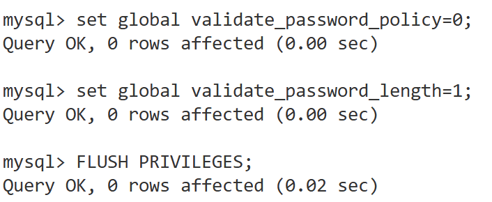 可以进入mysql 进行设置,下图分别是 设置全局密码安全等级,最小密码的字符长度
