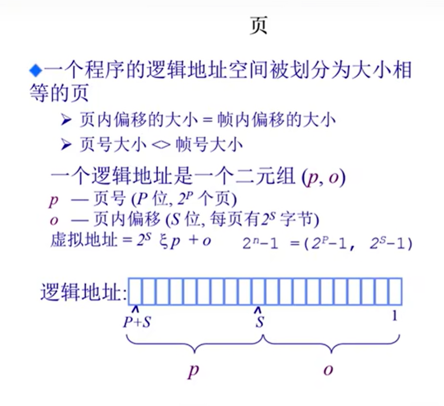 划分逻辑地址空间至相同大小的页:大小为2的幂次,e.g. 512 4096 8192