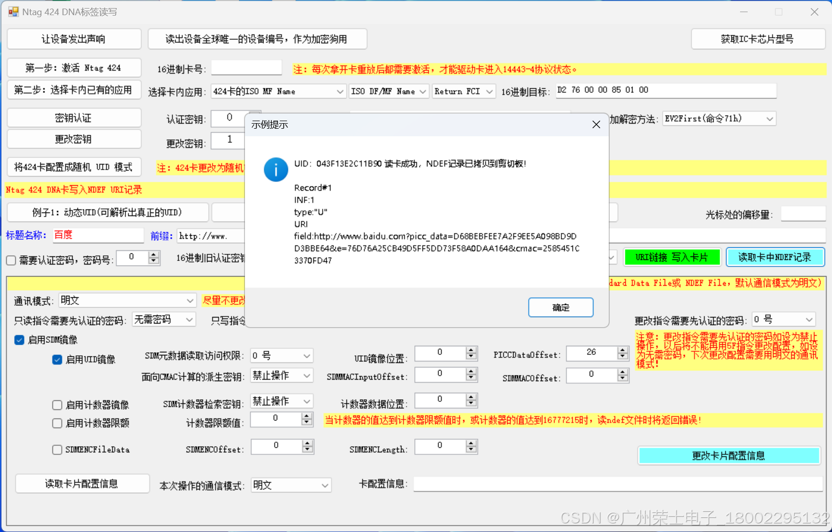 MessageBox.Show(carduid + ",URI网址写入成功!!", "示例提示", MessageBoxButtons.OK, MessageBoxIcon.Information);