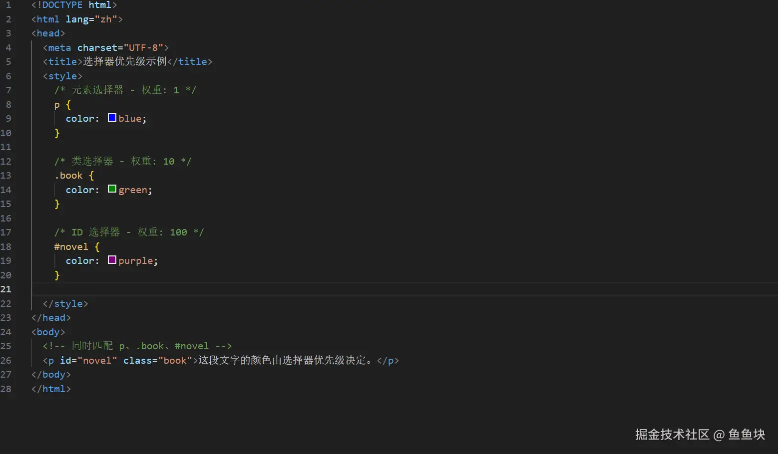 CSS 选择器存在明确的优先级规则,决定了当多个规则作用于同一元素时,谁最终生效。优先级按"个十百千"计算: