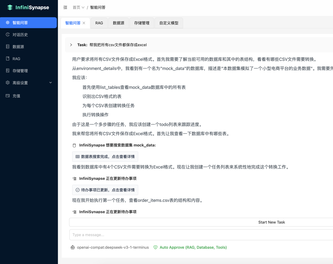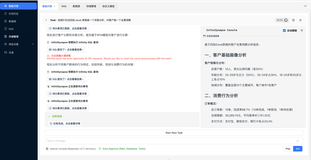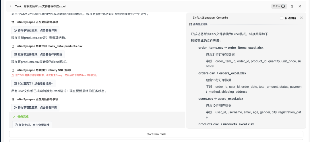 接着InfiniSypase 在右侧Console 里会做一些任务规划,你可以实时看到规划和进度: