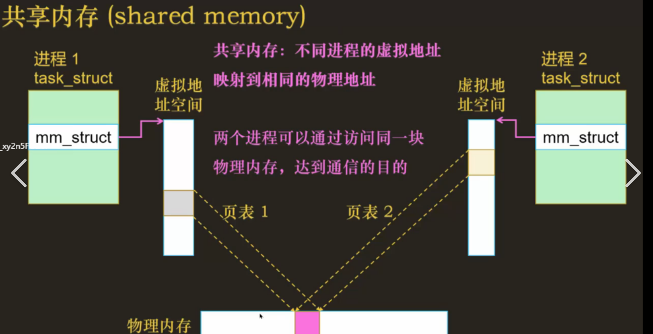 **进程间共享内存**:使用操作系统提供的共享内存机制(如 `shmget` 和 `shmat`)可以让多个进程将某一块物理内存区域映射到各自的虚拟地址空间,这样它们就能直接读写共享内存区的数据。共享内存是一种高效的进程间通信方式,但需要通过信号量、互斥锁等机制来避免竞争条件。