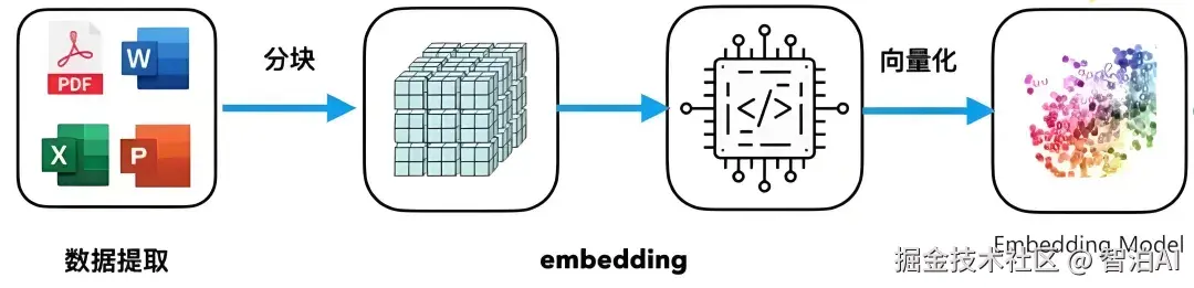 文字本身无法直接运算,但是如果把文字转换成数字向量,就可以进行计算了。而这个过程,叫做"向量嵌入"。