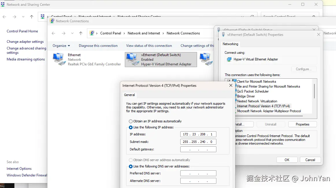以笔者的环境为例。在一个Windows 11系统中,运行了一个Linux子系统(WSL2,具体为Debian 13)。默认情况下,Windows会为这个系统创建一个NAT虚拟网卡(vEthnet, 172网段,下图),并与宿主机进行通信,这样,除了宿主机之外,对于其他主机而言,它其实就是一个独立的私有网络。在宿主机上的各种操作是没有问题的。但是,如果想要把在WSL中运行的Web应用,发布到外部(相对于宿主机),就会出现无法直接访问的问题。
