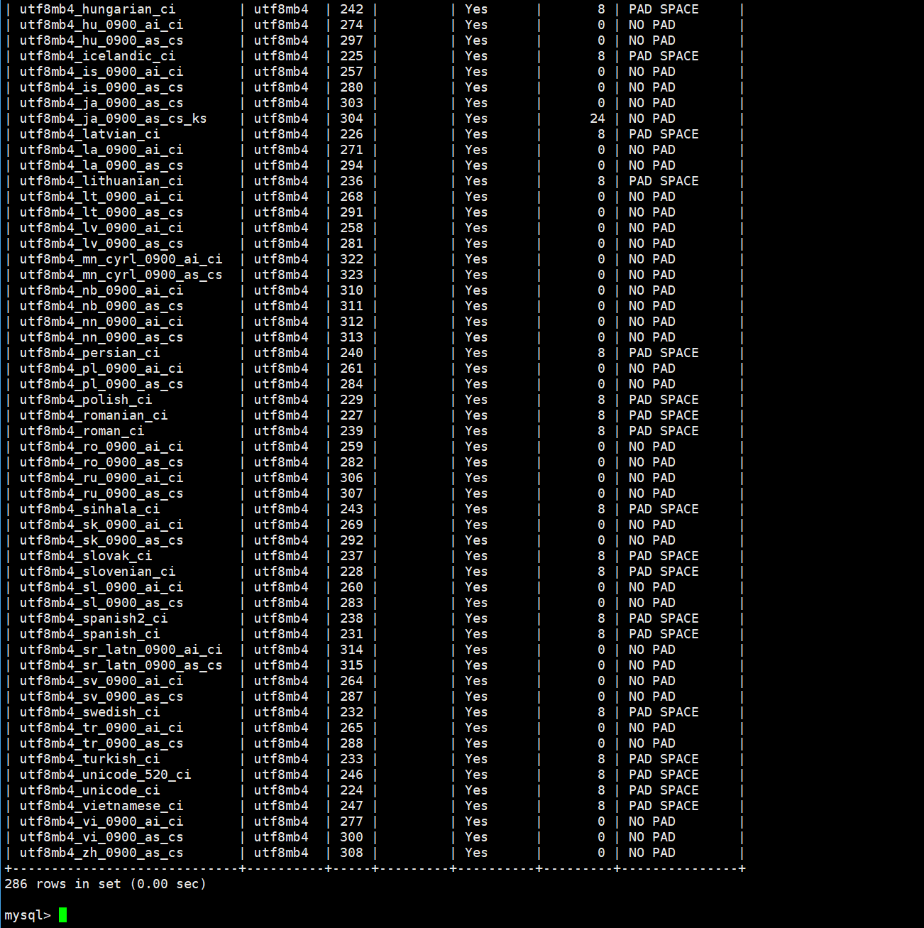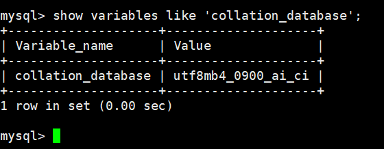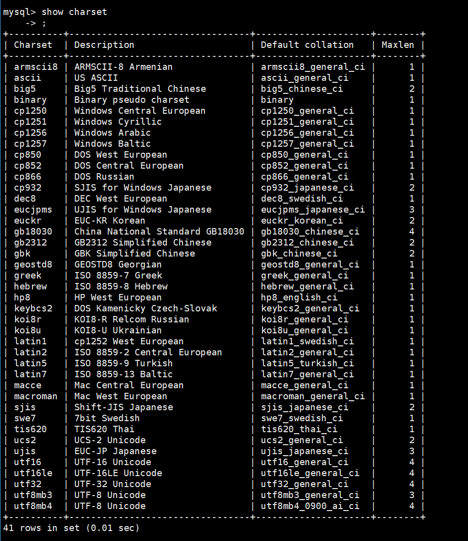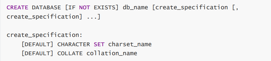 \] 是可选项 CHARACTER SET: 指定数据库采用的字符集 COLLATE: 指定数据库字符集的校验规则