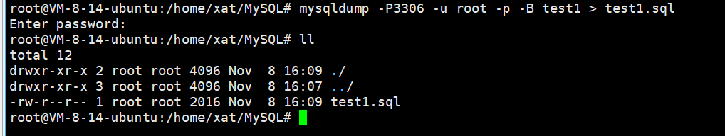 mysqldump -P3306 -u root -p -B test1 > test1.sql