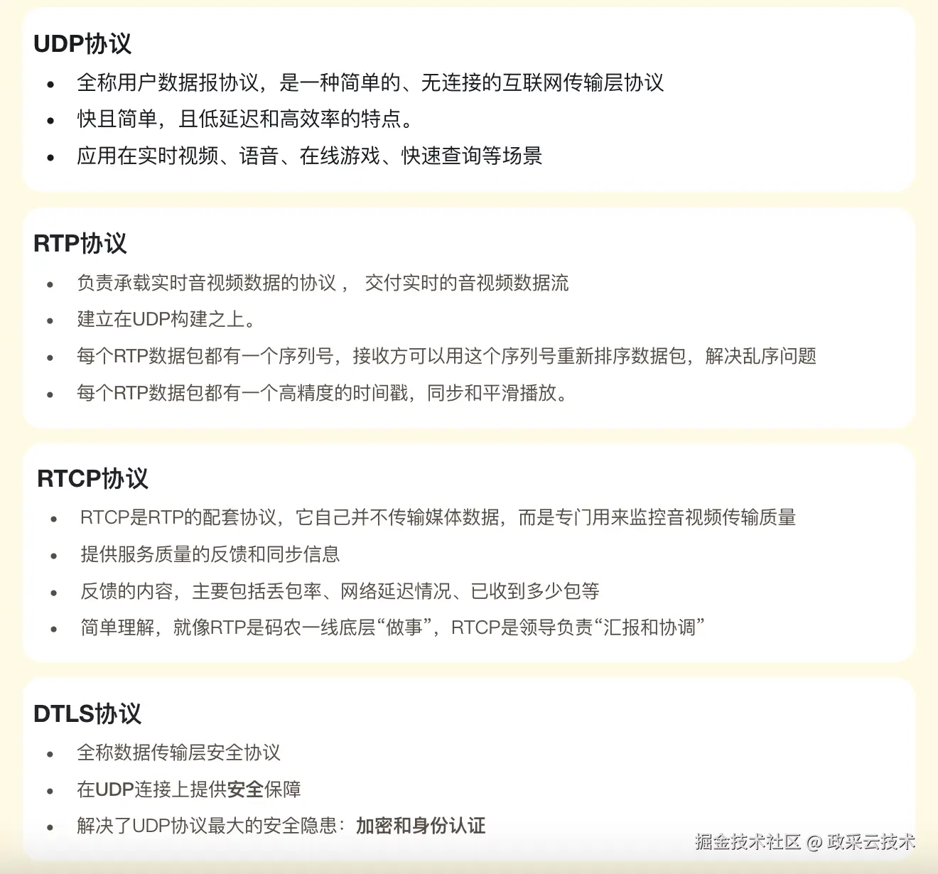 WebRTC的传输协议主要包括以下几个方面,基于下面几个协议来保证实时音视频既流畅又安全。