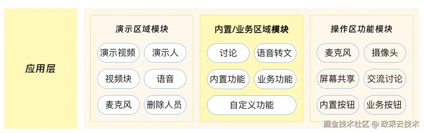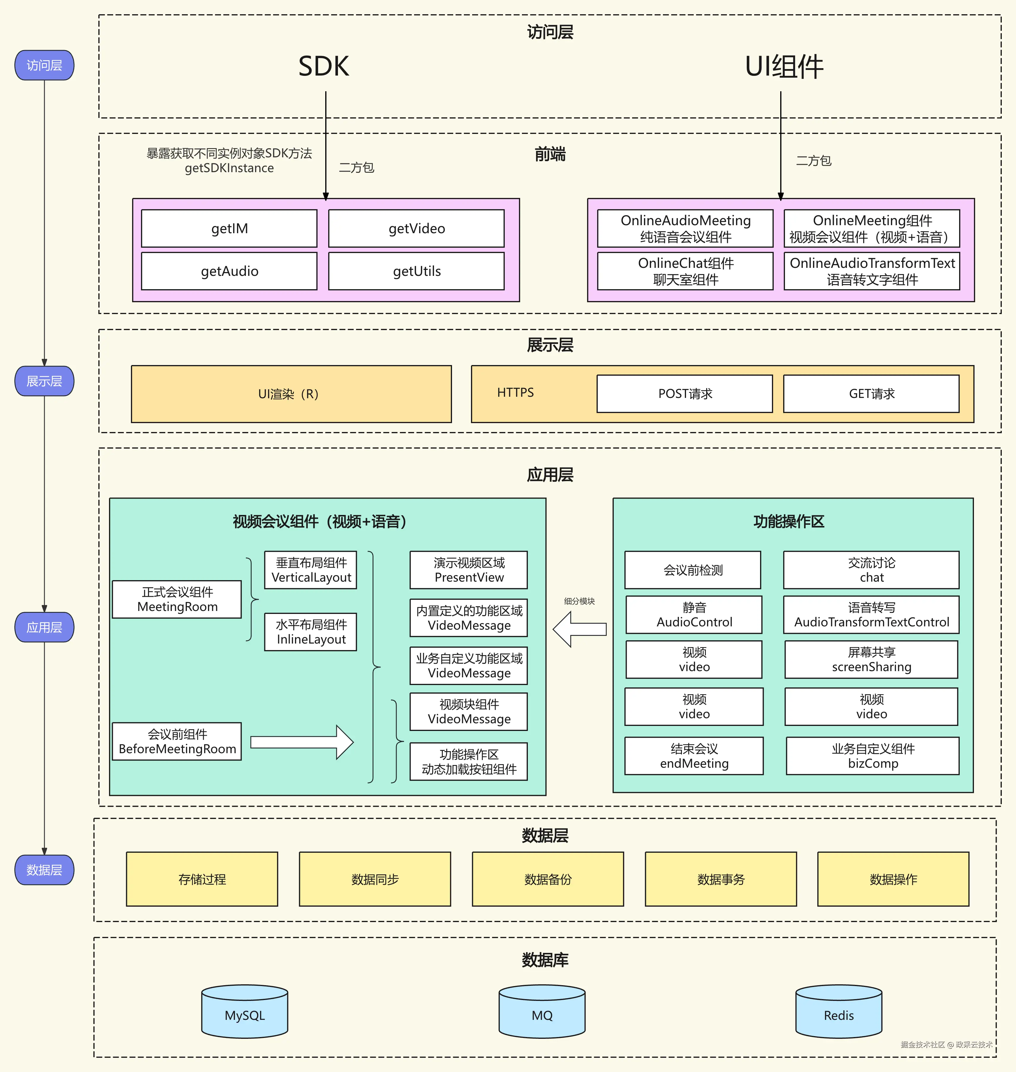 音视频通用化组件,会提供基于音视频底层能力,提供SDK和UI组件二方包两个产物,针对每个SDK中,会提供语音转文字、聊天、纯语音、视频+语音等SDK, 可以供不同的场景使用,比如桌面录屏等需要单独调用SDK , 其次针对UI组件,会打包封装好的整套UI产品,通过配置参数,即可实现整套音视频的功能和使用。