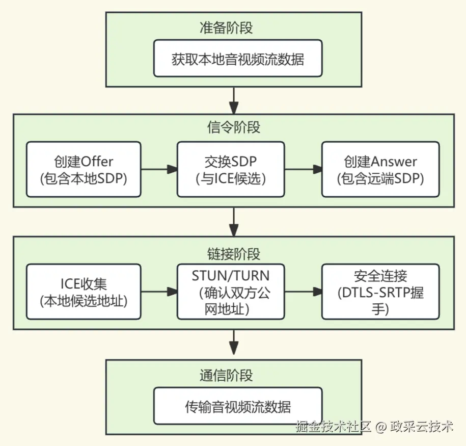 如下图所示,整个音视频过程,包括 前期的准备阶段、信令阶段、链接阶段、最后的通信阶段,大致过程如下所示流程图所示: