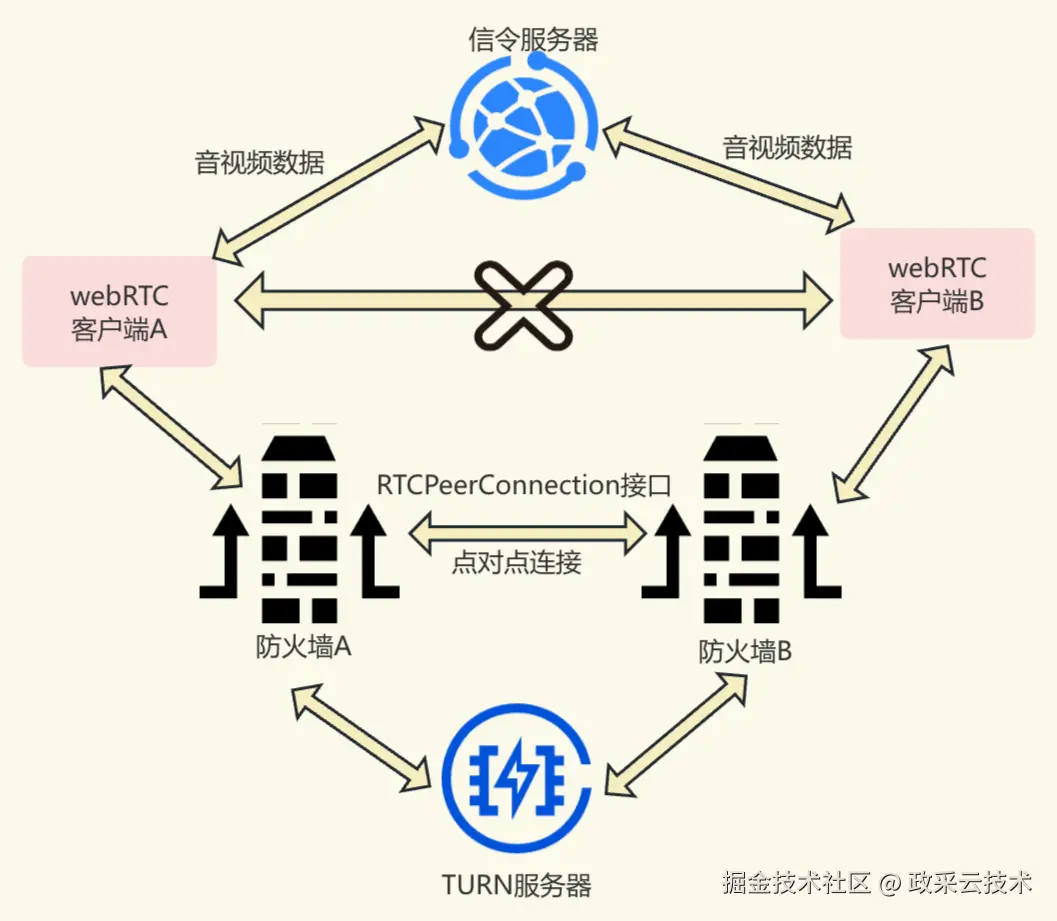 客户端A 与客户端B之间,因为防火墙的限制是无法进行通信的,需要借助TURN服务器,进行点与点之间的链接,大致基本原理可以用下图来说明: