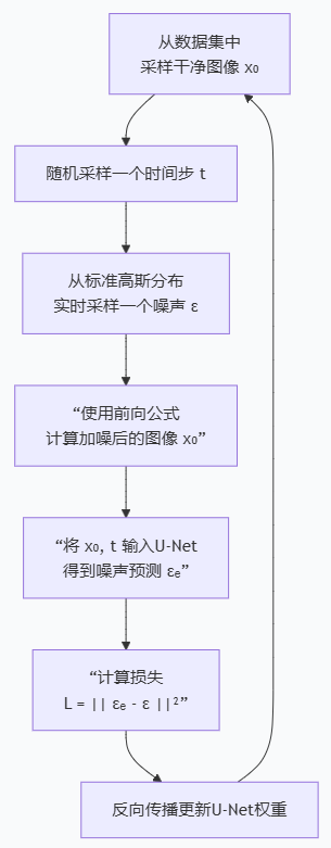 这个循环的关键在于第3步:对于每一个训练样本(x₀x_₀x₀),在每一个随机时间步(ttt),我们都会实时地从一个标准高斯分布中重新采样一个全新的、独立的噪声(εεε)。