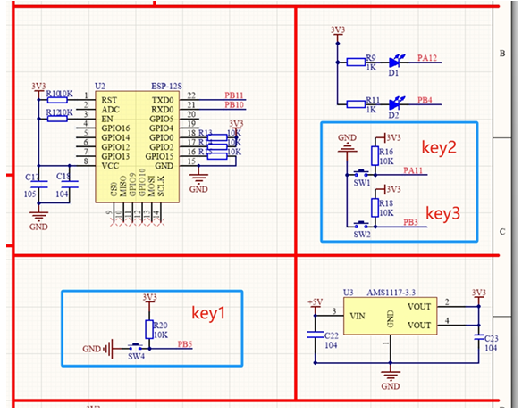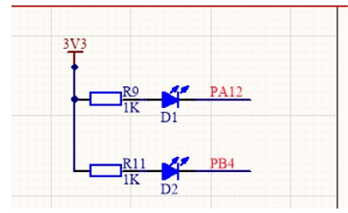 开发板中,按键1接在PB5,按键2接在PA11,按键3接在PB3,LED1接在PA12,LED2接在PB4。如 下图:
