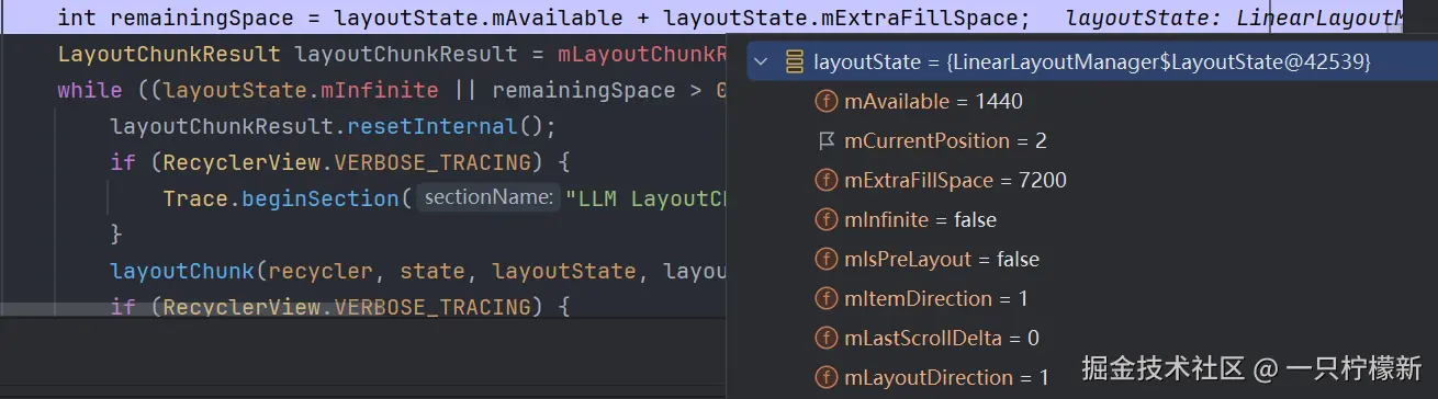 int remainingSpace = layoutState.mAvailable + layoutState.mExtraFillSpace;