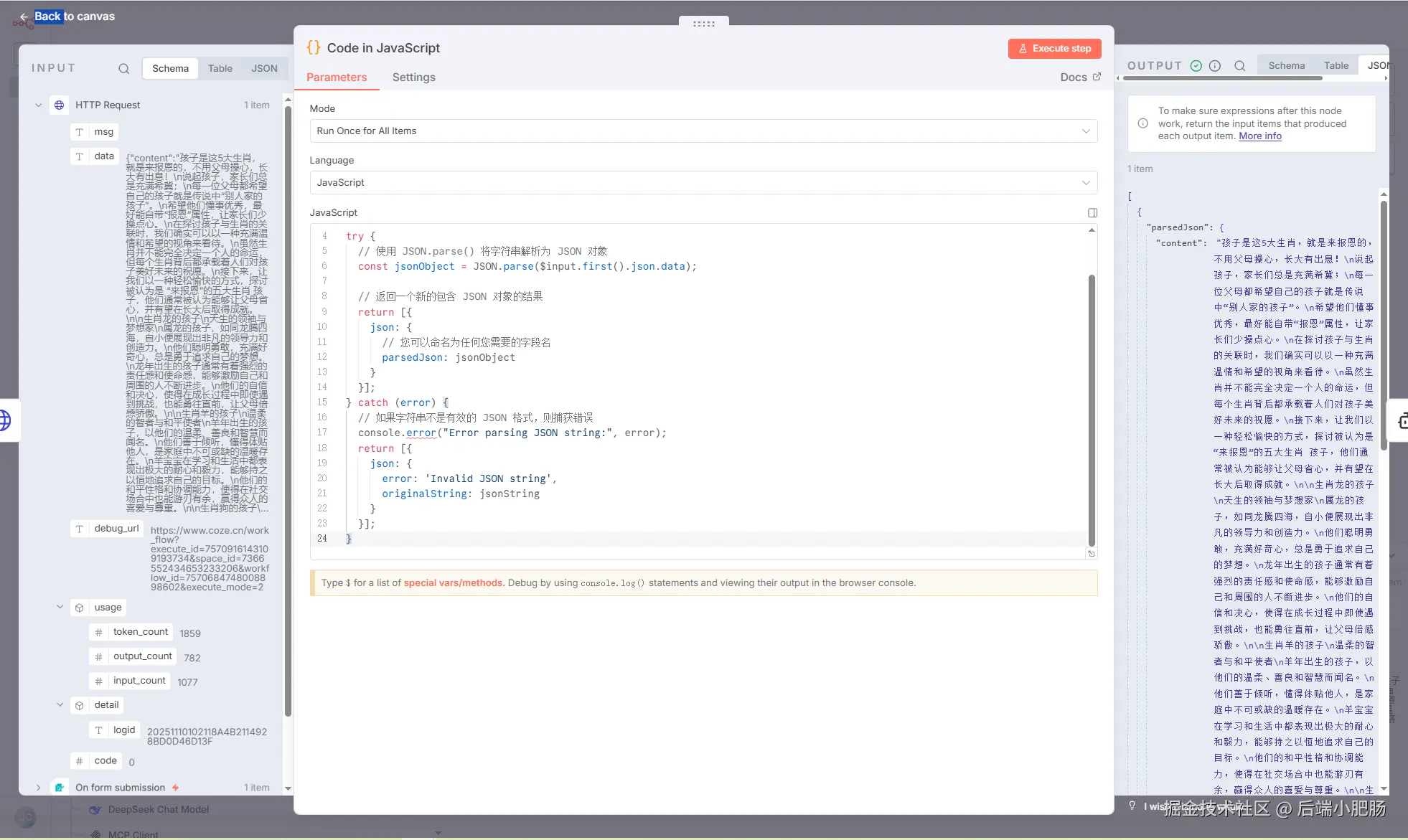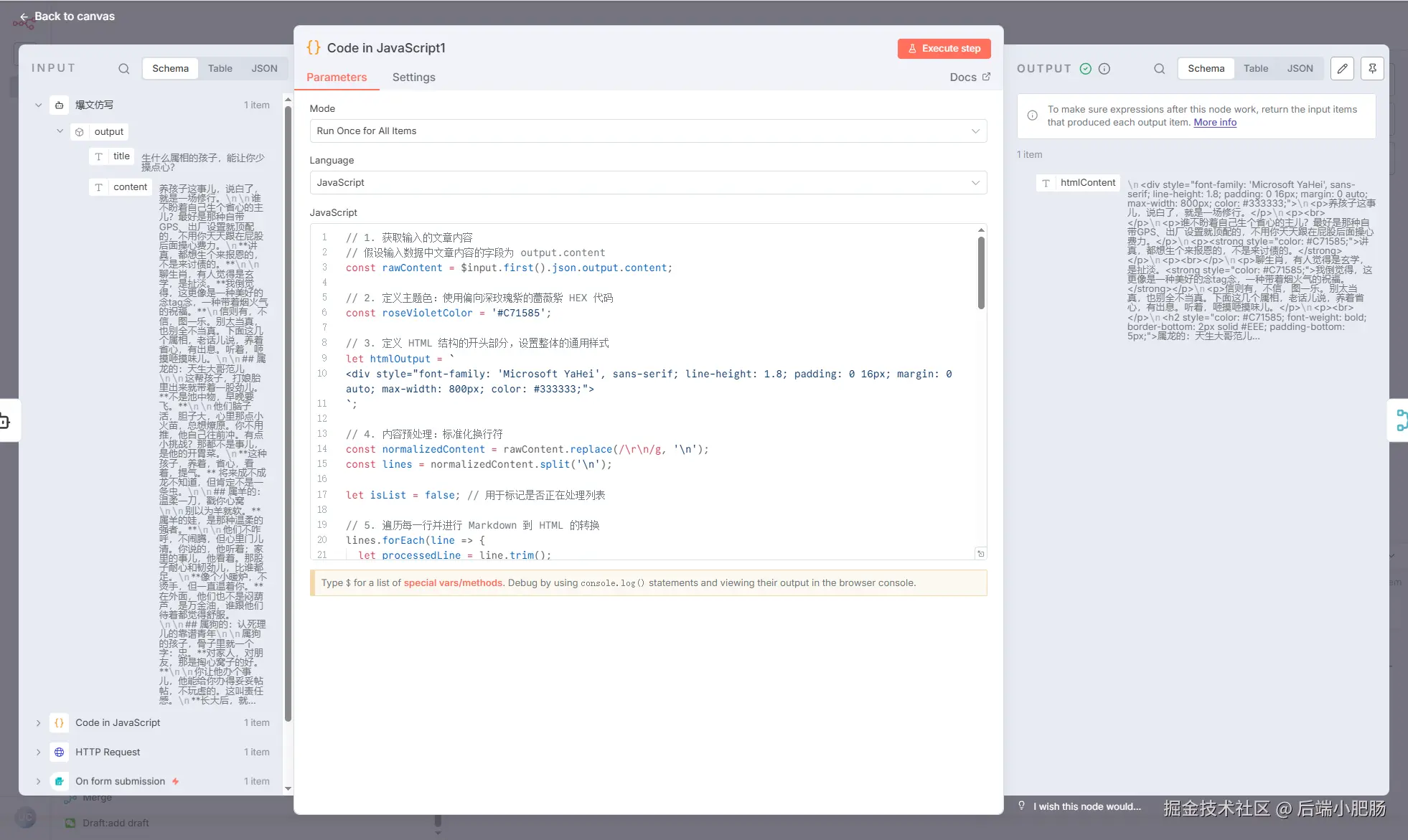 Code in JavaScript1:爆文仿写( AI Agent) 节点出来后点击【+】新增Code in JavaScript,这个节点的作用是将正文内容改写成html格式内容。