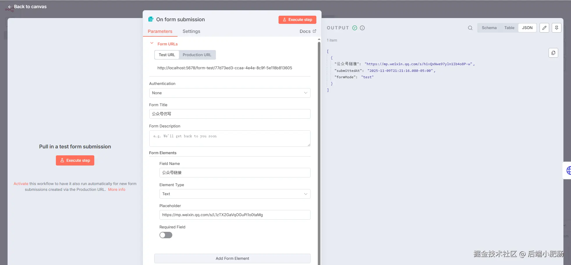 - 点击 【add Form Element】 节点新增表单要素,在Field Name填入公众号链接,Element Type选择text,Placeholder任意填入一个公众号文章链接。