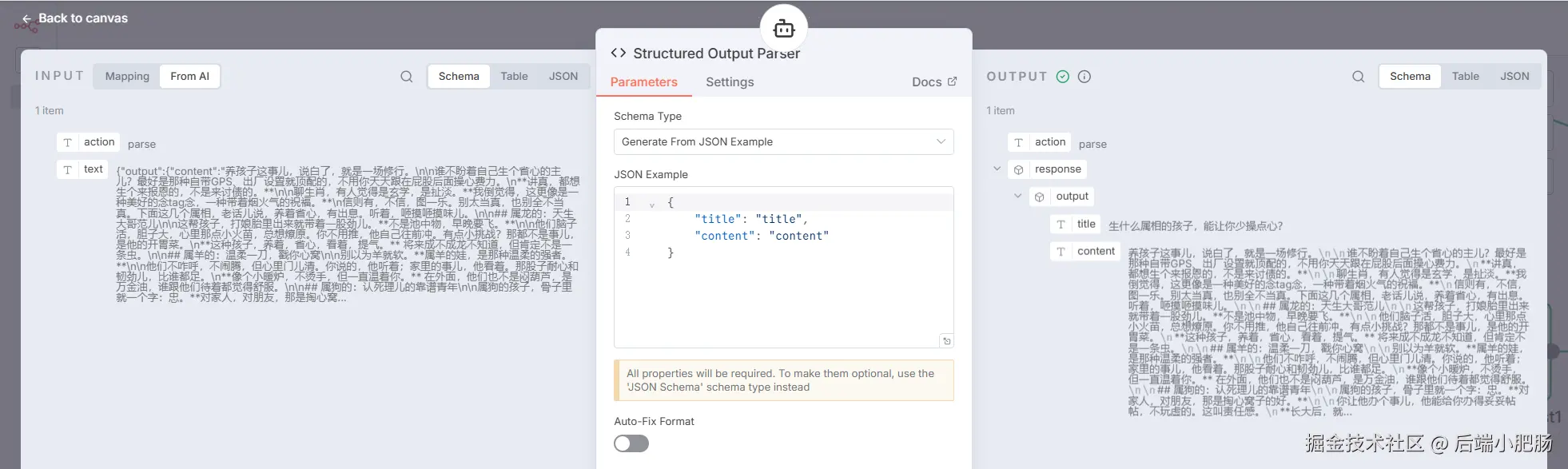 - 在Output Parser处点击【+】,规整输出格式,JSON Example处填入: