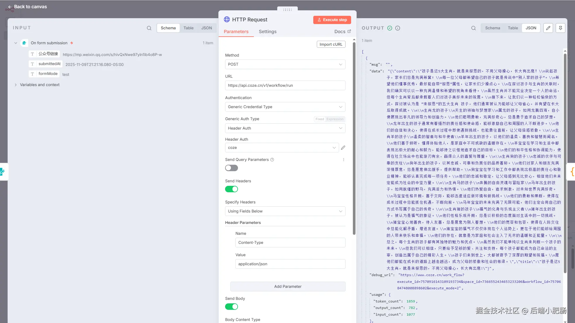 HTTP Request(调用Coze获取公众号文章内 api ): 开始节点出来后点击【+】新增HTTP Request, 这个节点的作用是调用Coze工作流的api根据输入文章的url来获取文章的标题和内容。