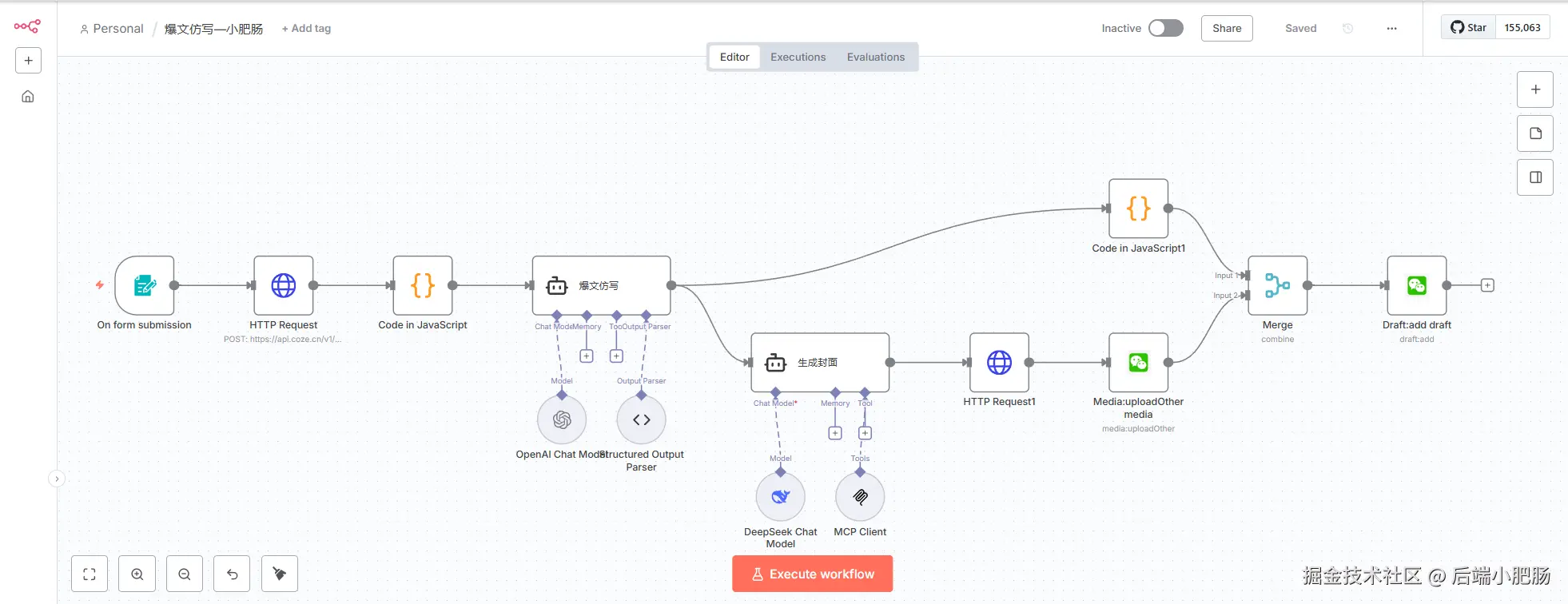 本文详细拆解了如何利用 n8n 强大的自动化能力,配合 Coze 和 AI Agent (如 Gemini 2.5 Pro 模型)实现一个高度自动化的公众号文章仿写工作流。从前置服务的开通、社区节点的安装,到工作流的每一个节点------数据获取、内容深度二创、封面图生成、格式转换,直至最终上传到公众号草稿箱 ,我们完成了整个一键仿写的闭环。