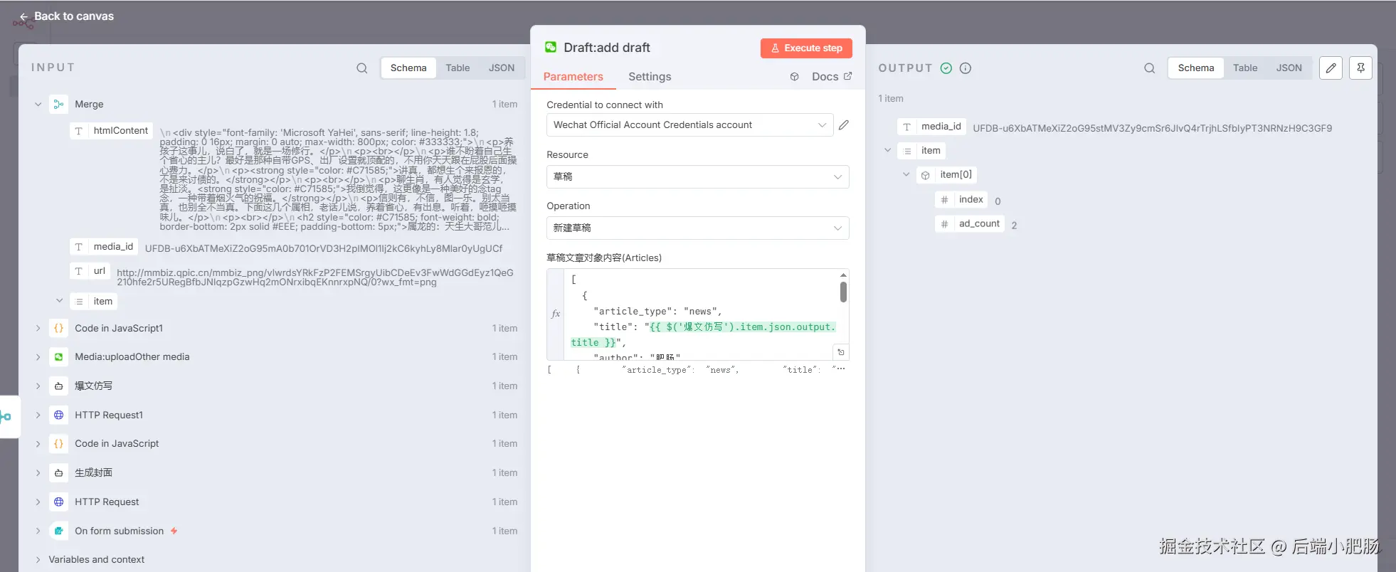 新增草稿:Merge 节点出来后点击【+】新增Draft:add draft节点,这个节点的作用是将前置节点生成的封面和正文都上传到公众号草稿当中。