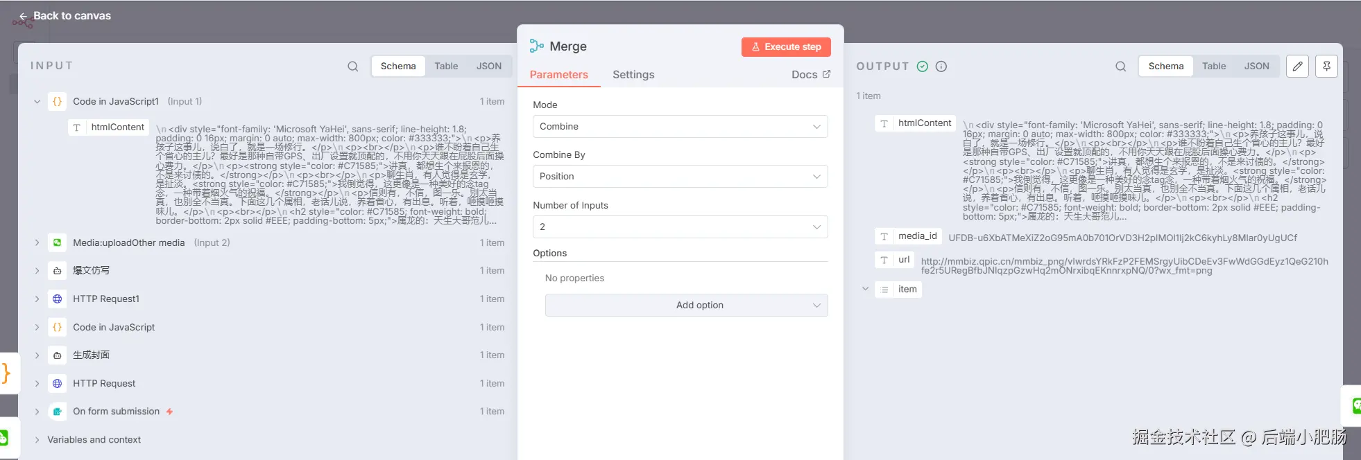 Merge:Code in JavaScript1和Media:uploadOther media 节点出来后点击【+】新增Merge。 这个节点的作用是整合前面生成的封面和仿写原文。