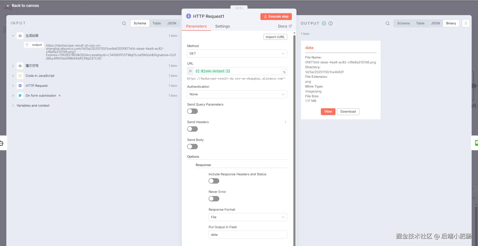 HTTP Request1(将封面图链接转换为文件):生成封面( AI Agent) 节点出来后点击【+】添加HTTP Request节点,这个节点的作用是把图片链接转换为文件格式。