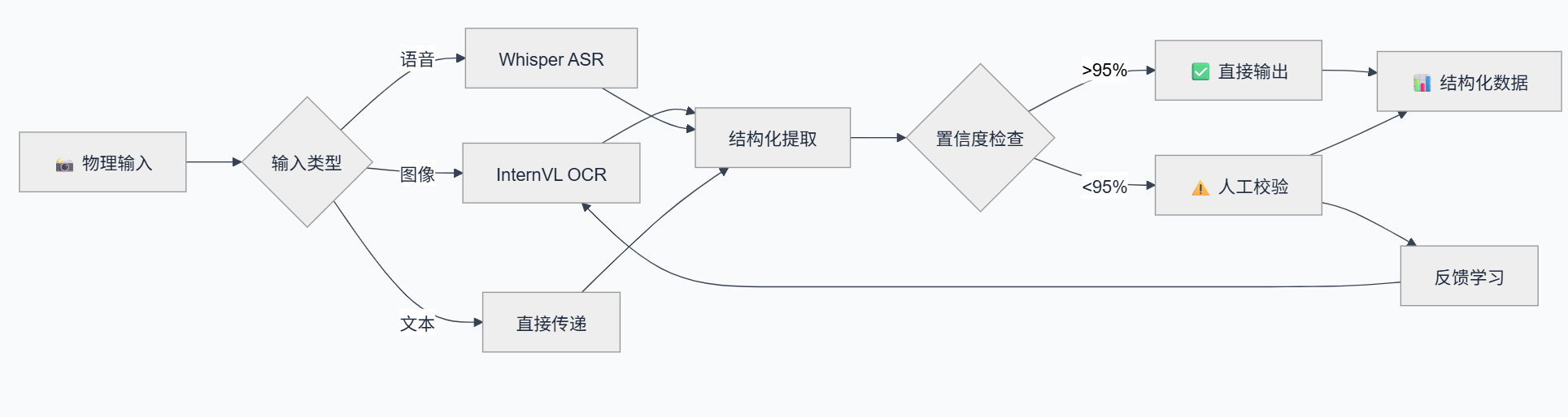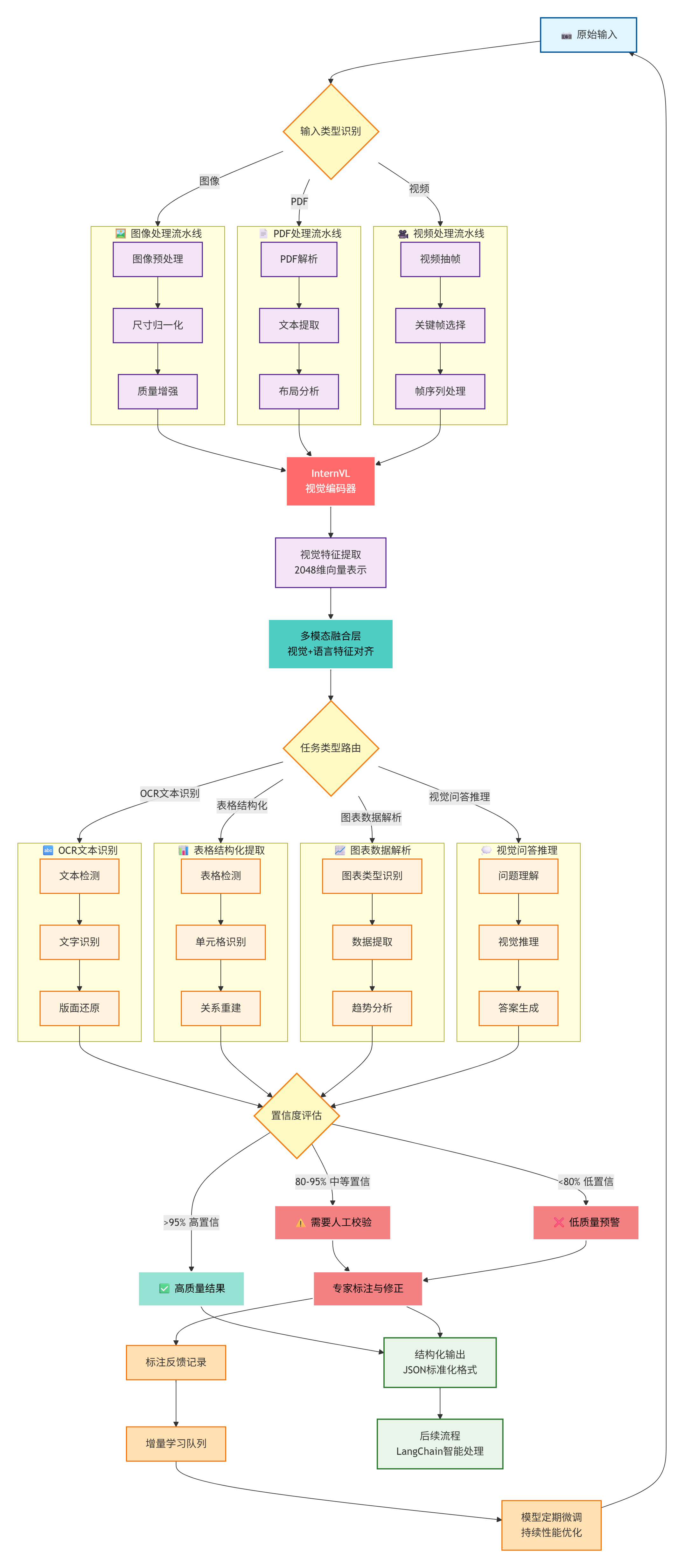 - 多模态大模型 视觉认知层: 采用InternVL等开源多模态模型,赋予系统"看懂"物理世界的能力,将纸质单据、图片转化为结构化数据,是实现"拍照制单"的技术基石。
