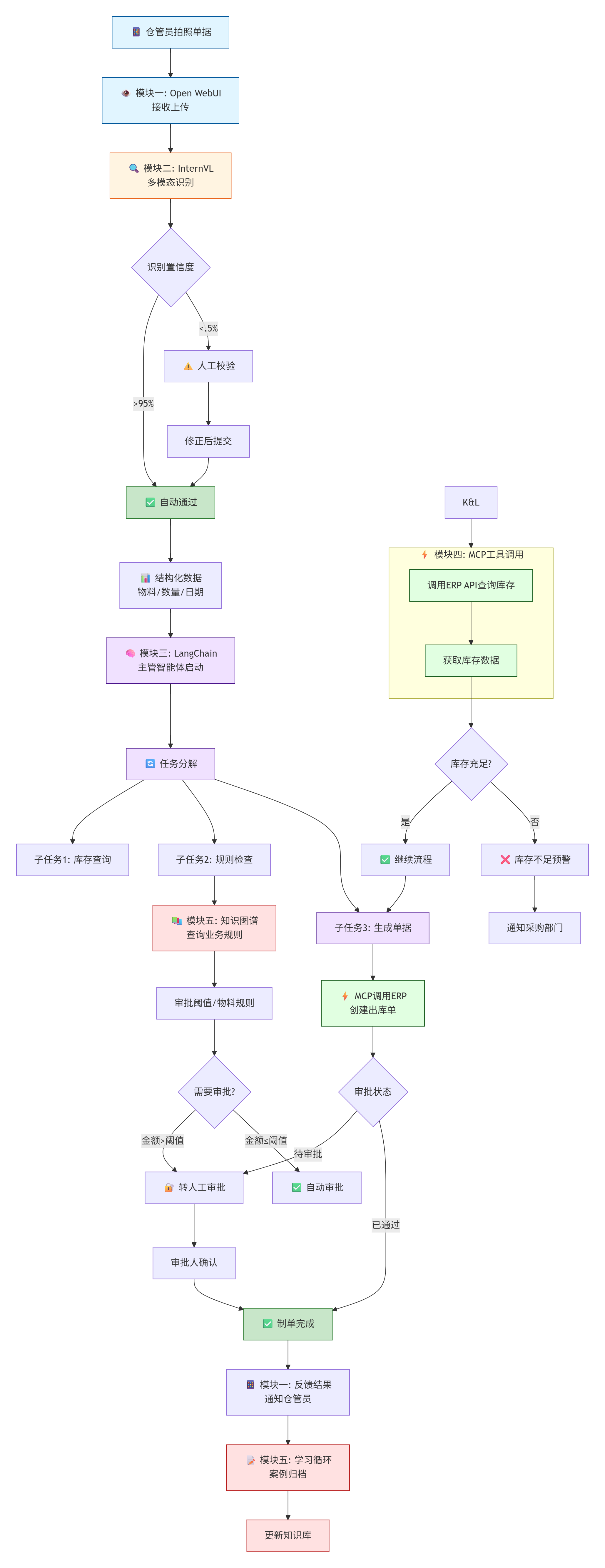 | 1. 感知 | L1 感知层 | 📸 单据照片 | InternVL识别 | {"物料":"A001","数量":100} |