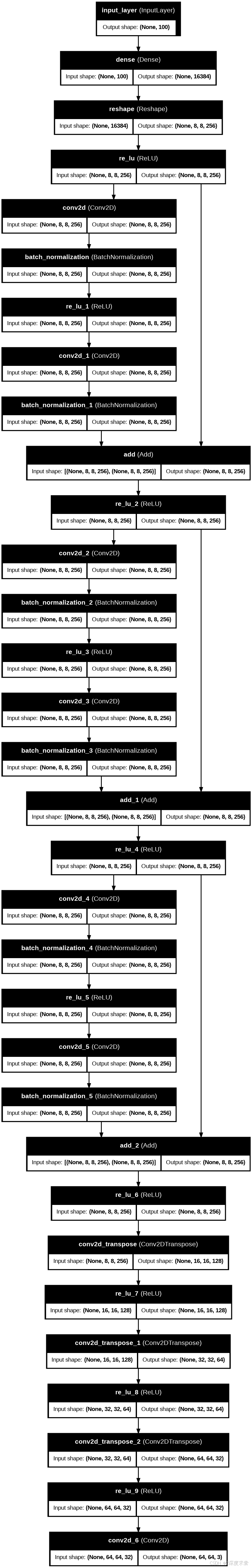 生成器(ResNet 风格) 输入随机噪声向量(噪声维度 NOISE_DIM = 100),通过转置卷积(Conv2DTranspose)+ 批归一化(BatchNorm)+ 带泄漏的 ReLU 激活函数(LeakyReLU)进行上采样,最终使用 tanh 激活函数输出 128×128×3 的图像。代码定义: