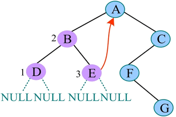 - 中序遍历 E 的左子树,E 的左子树为空,访问 E,中序遍历 E 的右子树,E 的右子树也为空,返回 A: