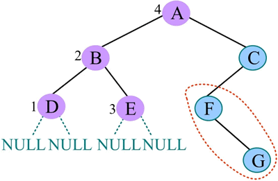 - 中序遍历 F 的左子树,F 的左子树为空,访问 F,中序遍历 F 的右子树: