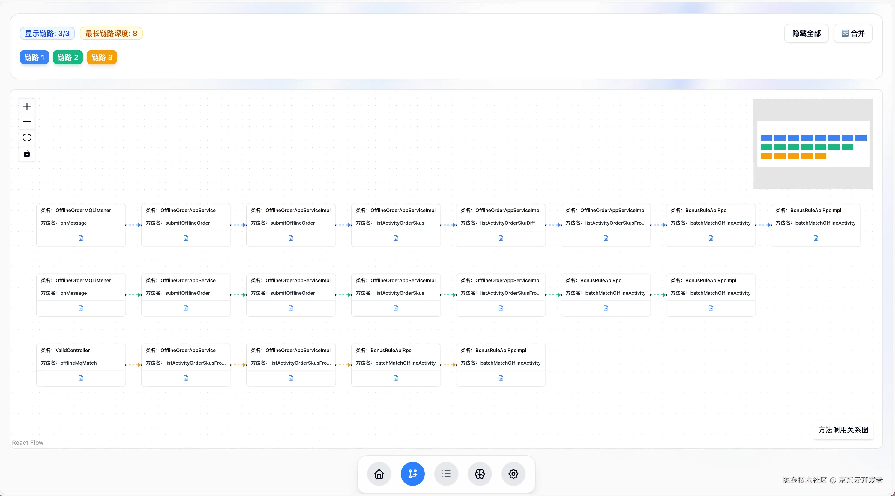 精准链路分析项目 ,黑马参赛项目,基于 Cursor 从零启动,单人仅用两天便快速构建出功能完整的精美 Demo。项目完整实现了基于 React Flow 的 JAVA 调用链路展示与组合 、AI 流式报告 及智能Agent对话 等多种高级能力。