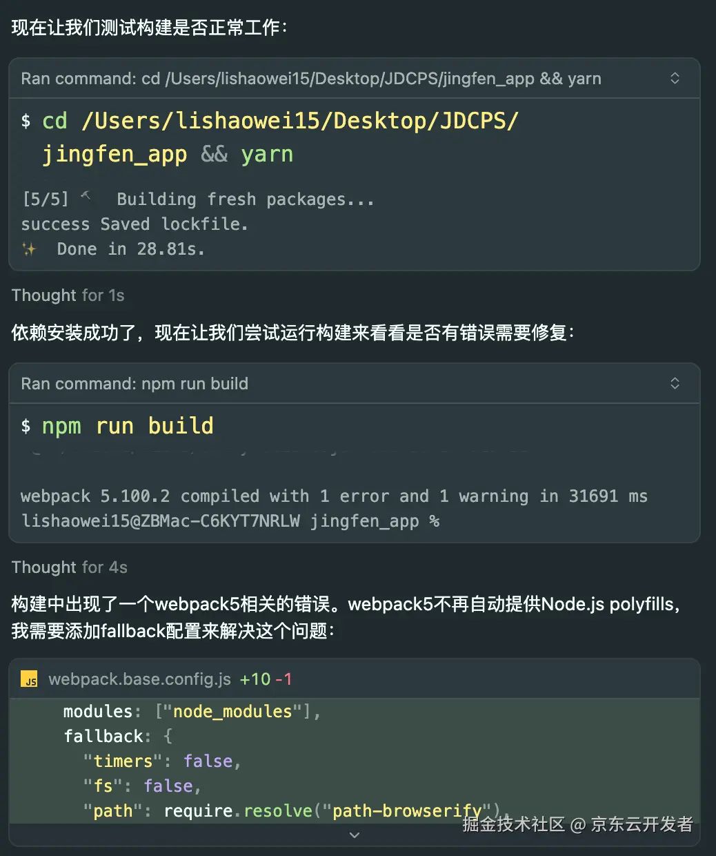 此外,我也让 Cursor 实现了京粉 h5 从 Webpack 到 Vite 的迁移路径验证,核心构建流程已全部跑通。目前因部分边界场景报错尚未完全解决,未形成正式文章,但该实践已初步验证 Cursor 在复杂工程链路中具备可行的辅助潜力。