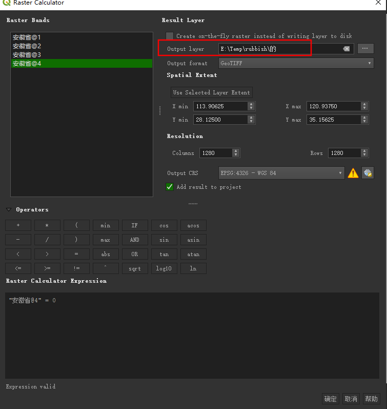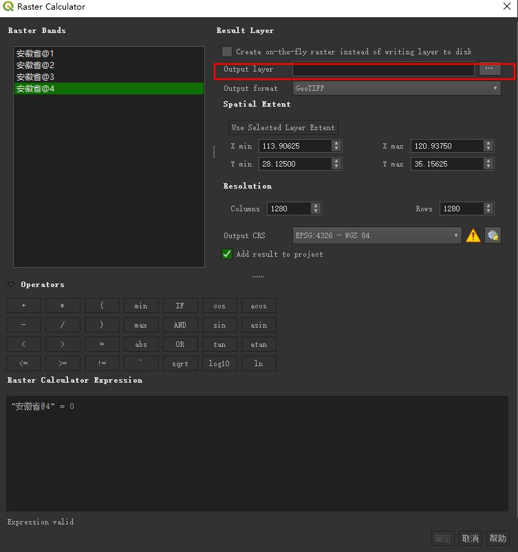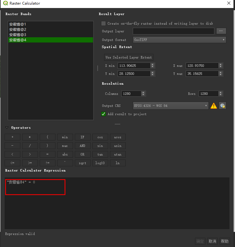 点击栅格计算器,输入如下公式(即选择第四波段为0的,0表示透明)