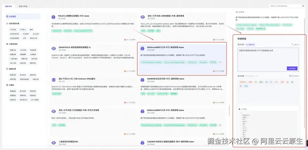 步骤二:在左侧页签可以选择不同的模型分类,选择模型卡片,可以在右边查看模型详情,并快速体验模型效果。