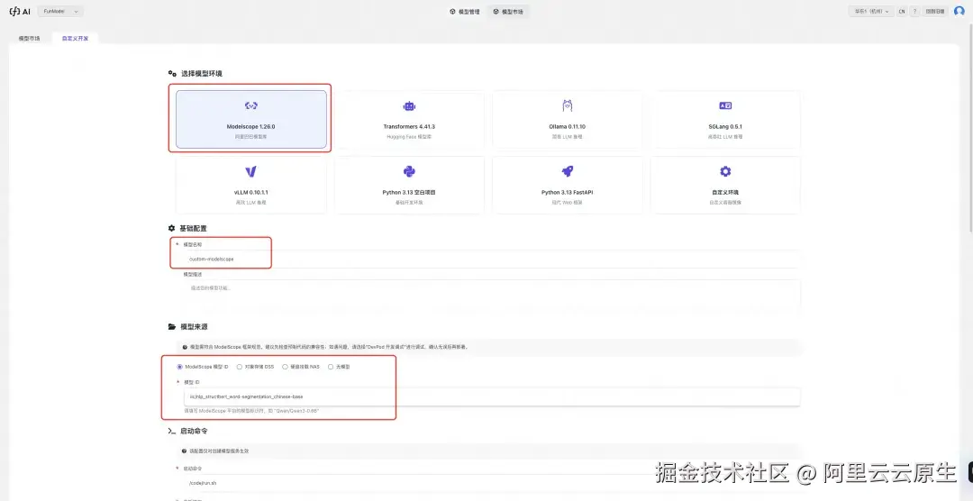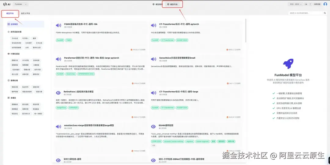 1\] FunModel 控制台 [functionai.console.aliyun.com/cn-hangzhou...](https://link.juejin.cn?target=https%3A%2F%2Ffunctionai.console.aliyun.com%2Fcn-hangzhou%2Ffun-model%2Fmodel-market "https://functionai.console.aliyun.com/cn-hangzhou/fun-model/model-market") \[2\] 自定义部署模型 [fun-model-docs.devsapp.net/user-guide/...](https://link.juejin.cn?target=http%3A%2F%2Ffun-model-docs.devsapp.net%2Fuser-guide%2Fcustom-model-deployment%2F "http://fun-model-docs.devsapp.net/user-guide/custom-model-deployment/")