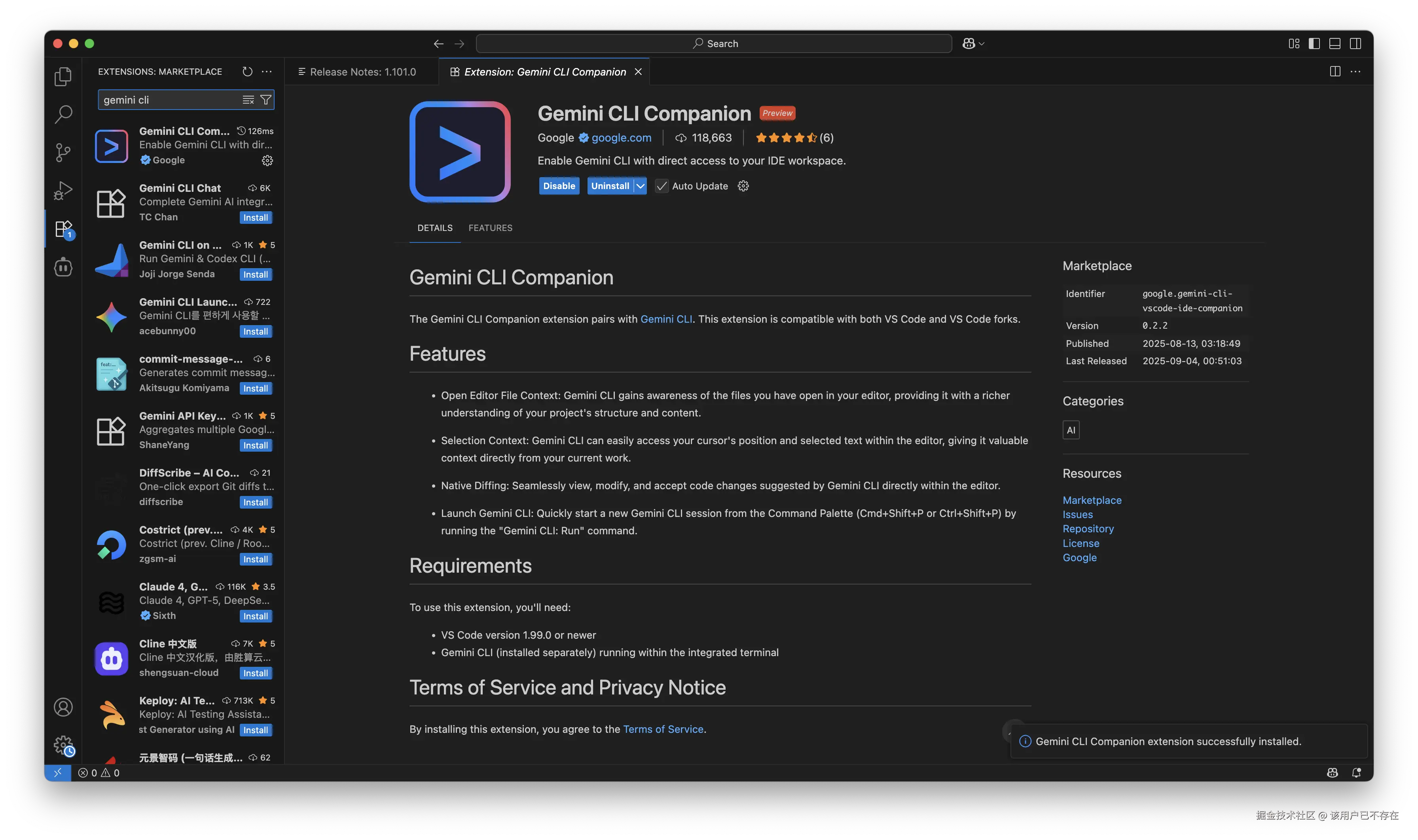PPT还是比较简单的,我们可以结合上编辑器一起来使用,让 Gemini 帮我们写代码。在VS Code 中搜索 Gemini CLI 扩展,下载安装。
