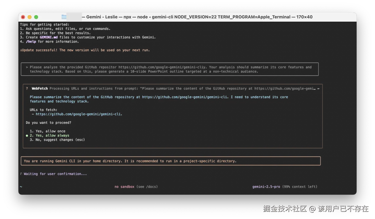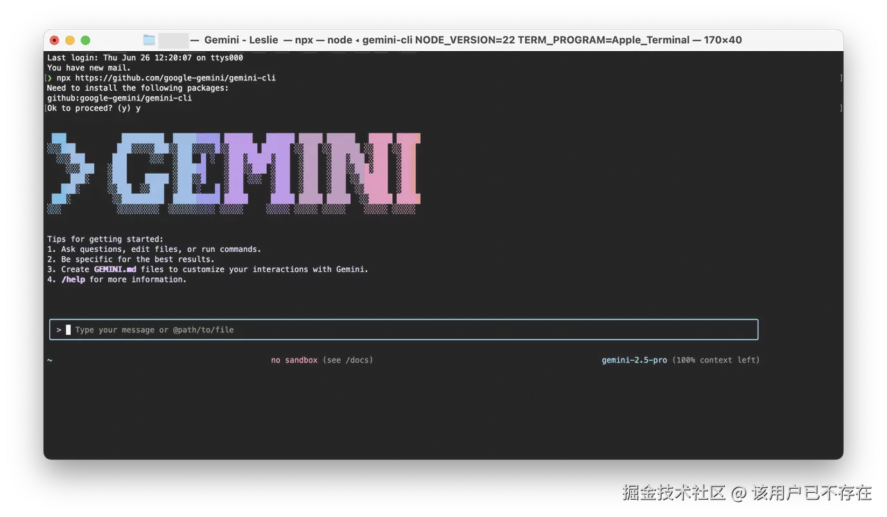环境准备好了,我们就可以开始安装 Gemini CLI 了。